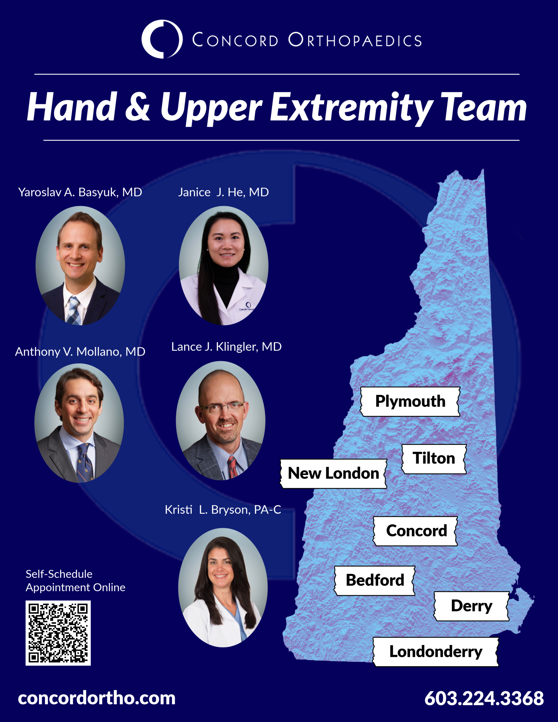 With this team, patients of Concord Orthopaedics have access to a comprehensive, multi-disciplinary hand and upper extremity service. Whether someone needs non-operative treatment (casting, injections, therapy) or advanced surgical care (microvascular procedures, minimally invasive surgery, arthroscopy, joint replacement), this group aims to provide care customized to the patient’s condition. Concord Orthopaedics