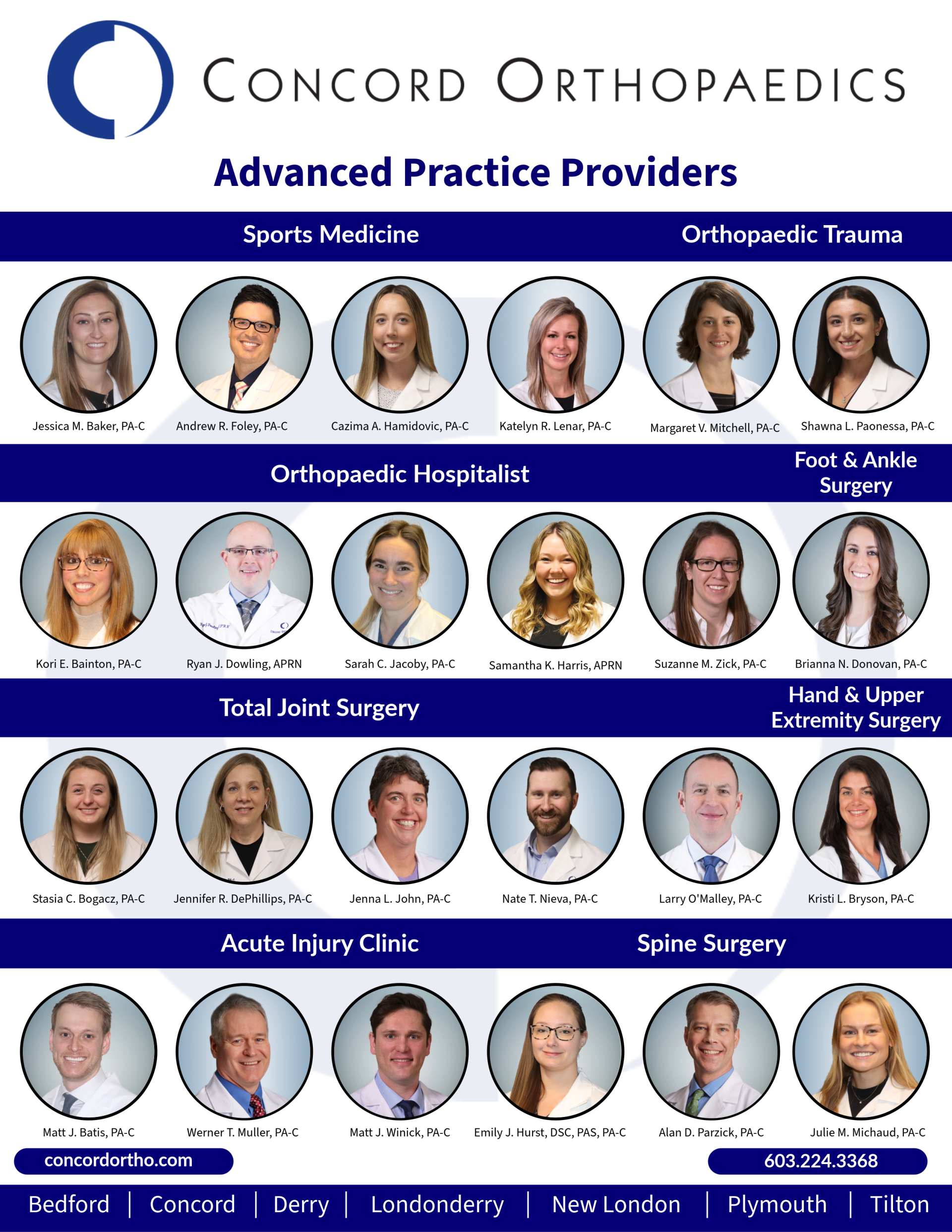 The Physician Associates at Concord Orthopaedics exemplify the highest standards of clinical excellence and patient care. Incredibly composed and confident in even the most complex situations, they bring a wealth of knowledge, precision, and professionalism to every patient interaction. Their deep understanding of orthopedic medicine, combined with their calm demeanor and collaborative spirit, ensures that patients receive exceptional care and support throughout their treatment journey. As integral members of the Concord Orthopaedics team, these highly skilled clinicians are trusted, respected, and valued by both patients and colleagues alike. CLICK TO VIEW